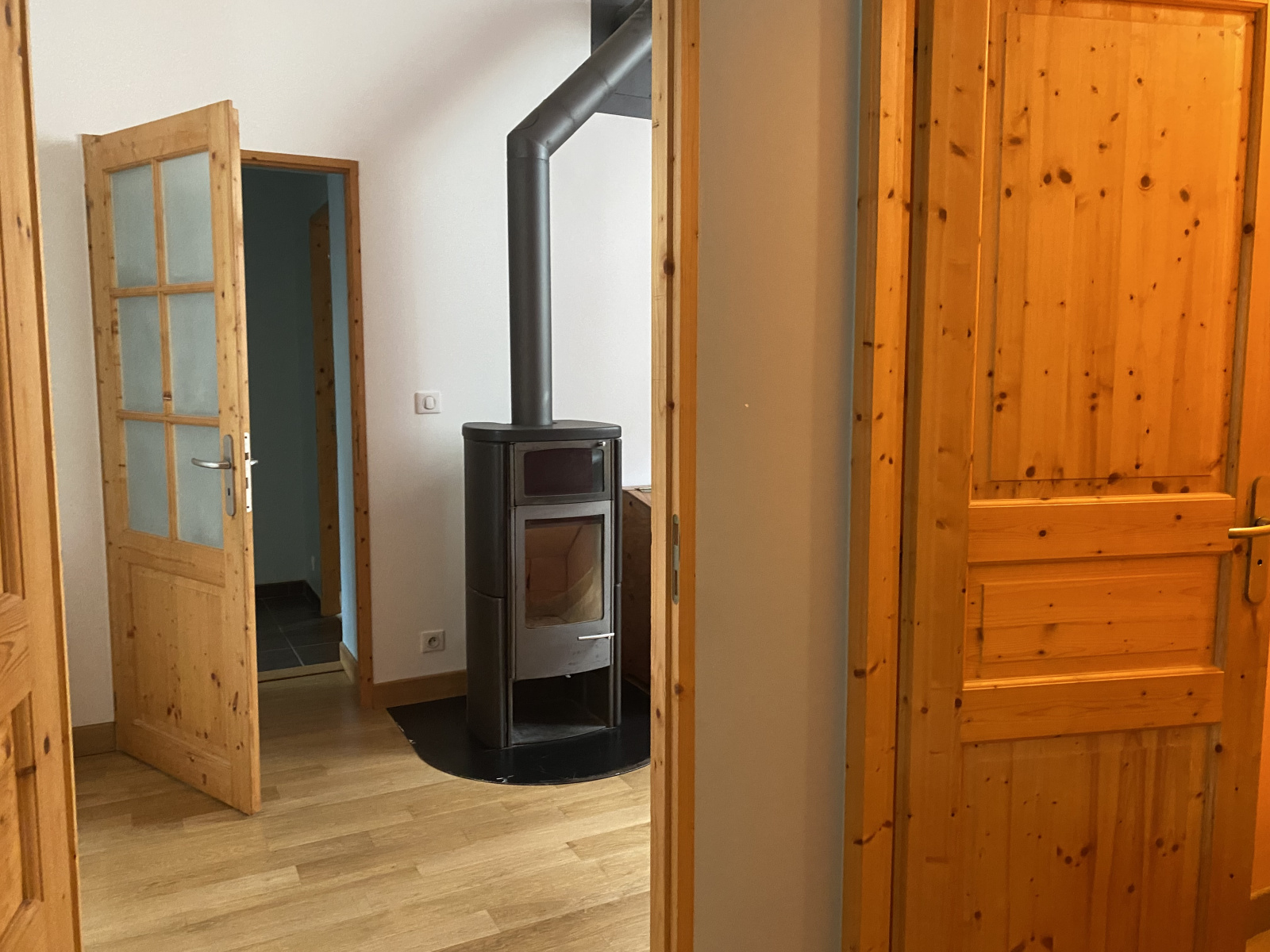 Un hall d'entrée accueillant.Une cuisine séparée du séjour par des verrières, offrant un style contemporain et chaleureux.Un séjour spacieux et lumineux.3 chambres, dont une suite parentale avec un dressing.Une salle de bain moderne avec baignoire, douche à l'italienne et WC intégré.Un espace bureau convivial équipé d'un poêle à bois, idéal pour le télétravail ou un coin lecture.Des espaces pratiques : cellier, buanderie.Un local indépendant avec accès à une terrasse privative, parfait pour des moments de détente en extérieur.De plus, ce bien est complété par un grand garage non attenant, idéal pour le stationnement ou le stockage.