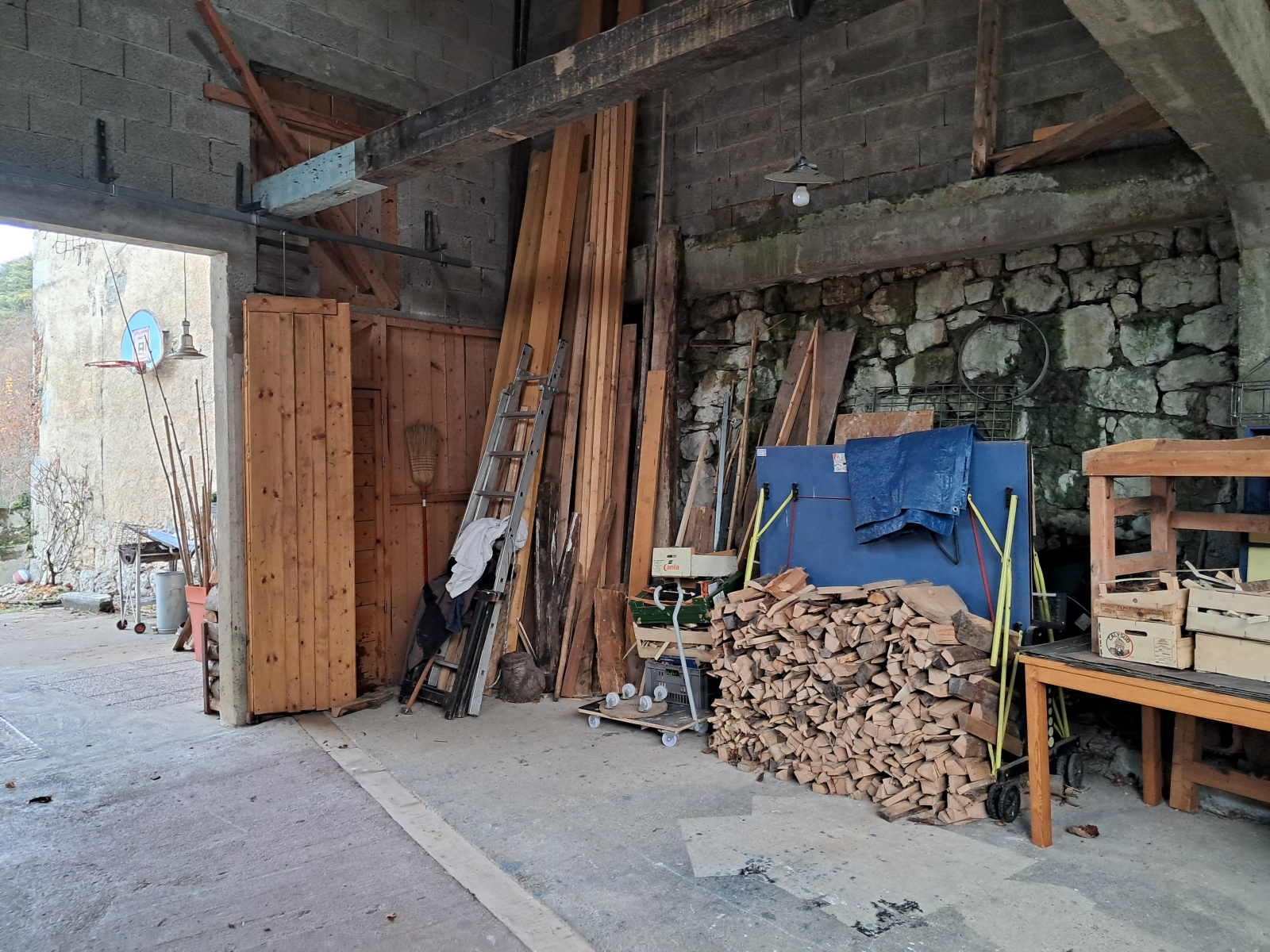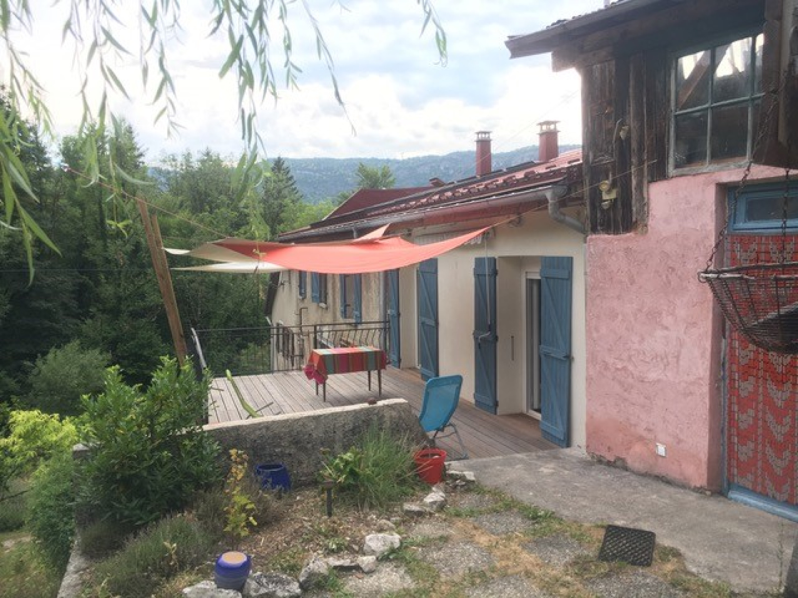 La maison bénéficie d'une source dans le jardin. Le volume du hangar laisse la possiblité de ranger un camping-car. un préau met à l'abris l'entrée de la maison.